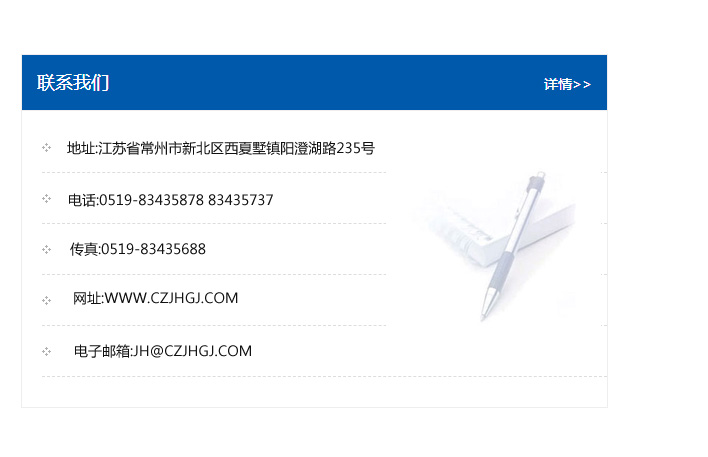 地址:常州市新北區友邦商務大廈1幢16、17層  電話:0519-85101652  傳真:0519-85112595  郵編:213022  網址:www_cz-jiayue_cn.gutaishan.com  郵箱:xiajifengaa@163.com